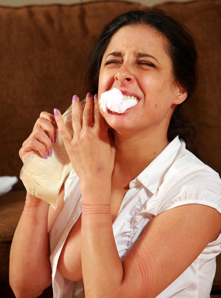 Jamie, being the defiant, strong willed Dominatrix that she is tells him to “FUCK OFF”, she isn’t telling him anything! They banter back and forth and finally the Goon says “Fuck it” and stuffs the very thick wad back in Jamie’s Mouth this time not only taping it in but wrapping it in tightly with elastikon, Jamie is screwed, no matter how much she flexes her jaw or twists the sticky elstikon flexes with it.