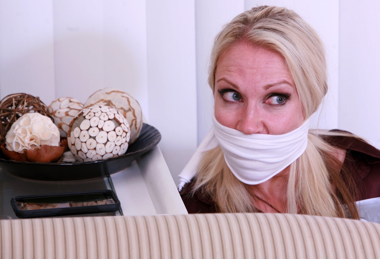 As Missey shows the annoying Goon around She comes up with a fairly simple plan, something She, and we, have all seen a gazillion times on TV and in the Movies…..that being, the bad guy ties up and gags the Girl so She cannot do anything giving him time to get all the things he wants and make a clean getaway, it would be hours before anyone may find her tightly bound and gagged in her own home.
