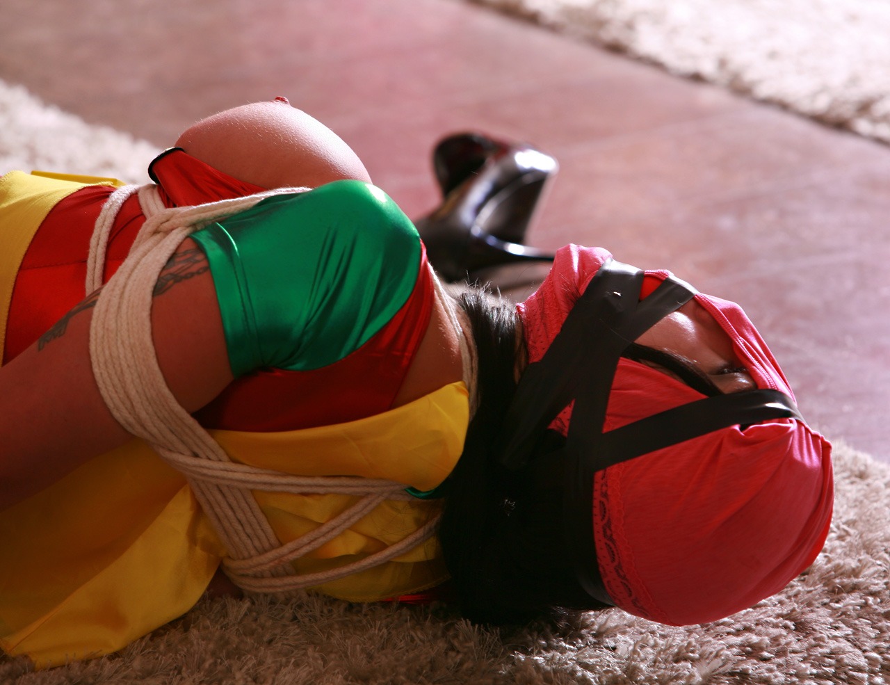 Gorgeous Big Mouthed Latina Cassandra can and does take a HUGE mouthful of packing as She loves being heavily gagged and Loves being frustrated and gagged protesting and you will see and hear it all in this intense, action packed scene with Cassandra being a Super Heroine who gets overpowered, very tightly bound up, massively gagged, panty hooded and Totally Humiliated with lots of grunting and frustrated gag bitching and gagged protesting!