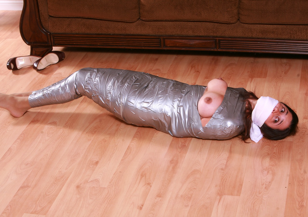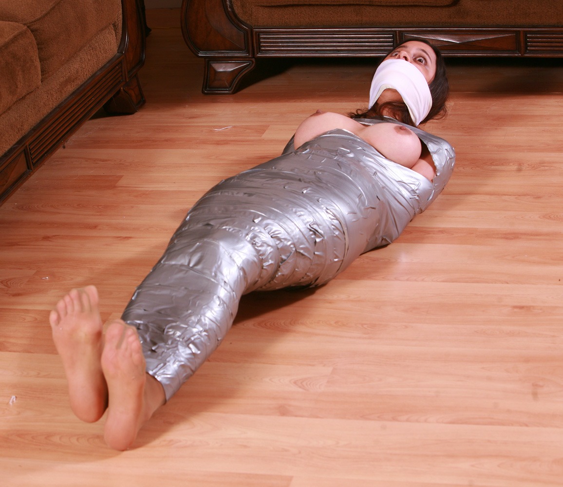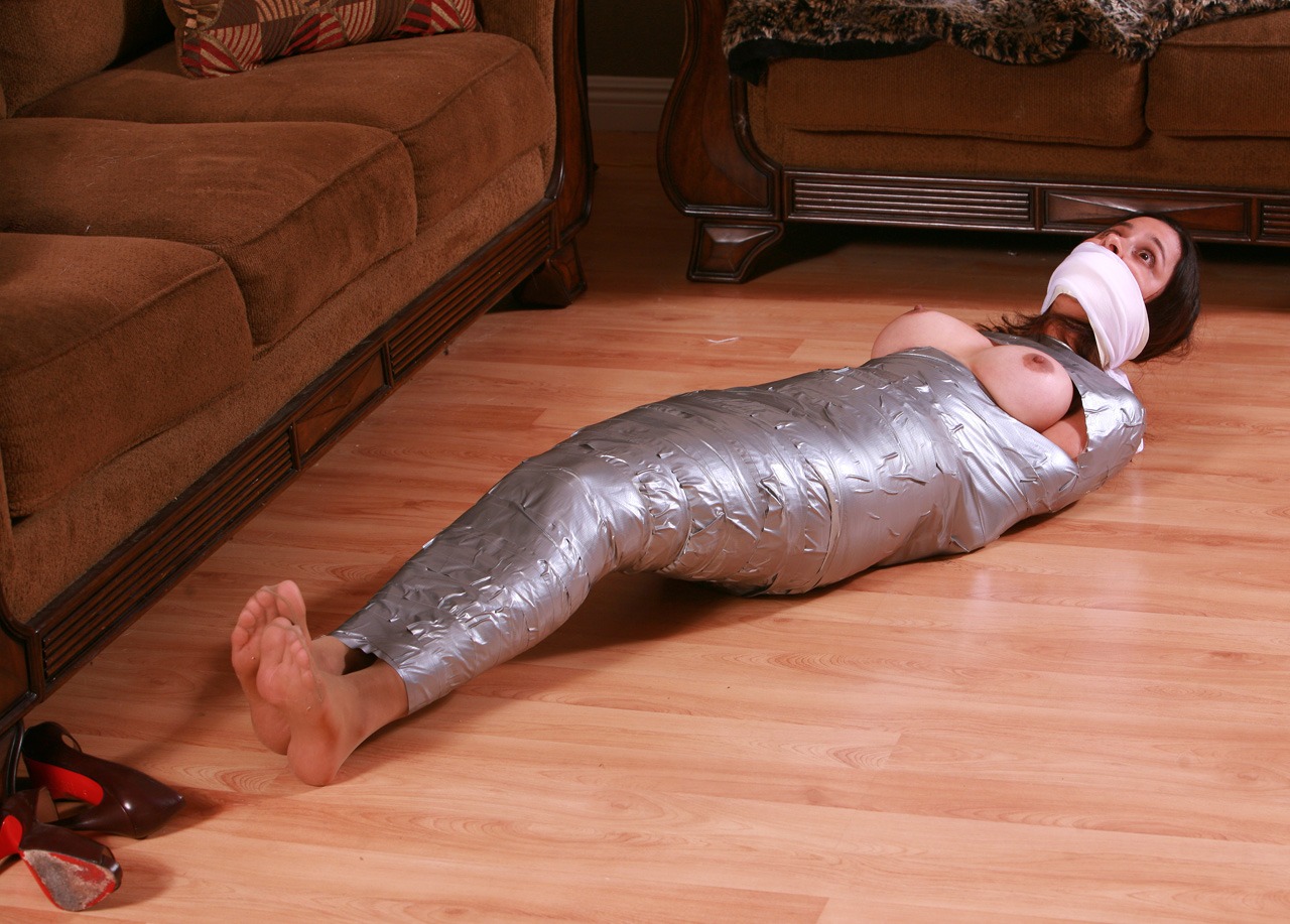 Jamie ends up getting Mummified with her Huge Boobies sticking out and thoroughly gagged, something a Bit unusual for a Real Life Dominatrix who specializes in Foot Fetish!