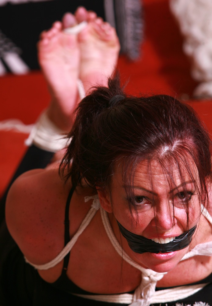 The Sessionist then goes on to tie her big toes together and play with and fondle her feet, all the while Tara grunts and gag bitches best she can but she is tied up tight, mouth fully packed, wrapped tight and finds herself exactly where she said she did not want nor would allow herself to be