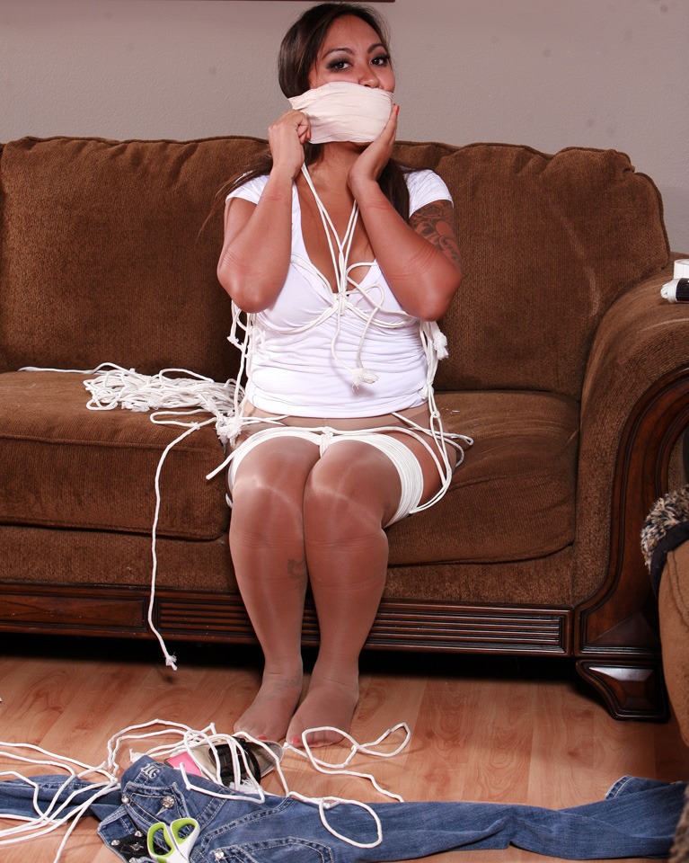 Finally after he has Veronica very tightly tied up with a few 100 feet of very thin cord he fully packs her smart ass mouth and she is left squirming, extremely and tightly tied up and very gagged, frustrated and angry over the fact she is going to be bound and gagged that way all night long unless she can figure something out.